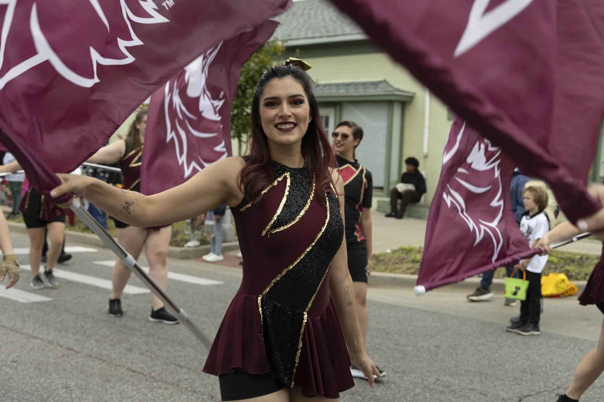 Saluki Silks member Salma Garcia flourishes her flag to the school song Oct. 25, 2025 at the Homecoming Parade in Carbondale, Illinois.