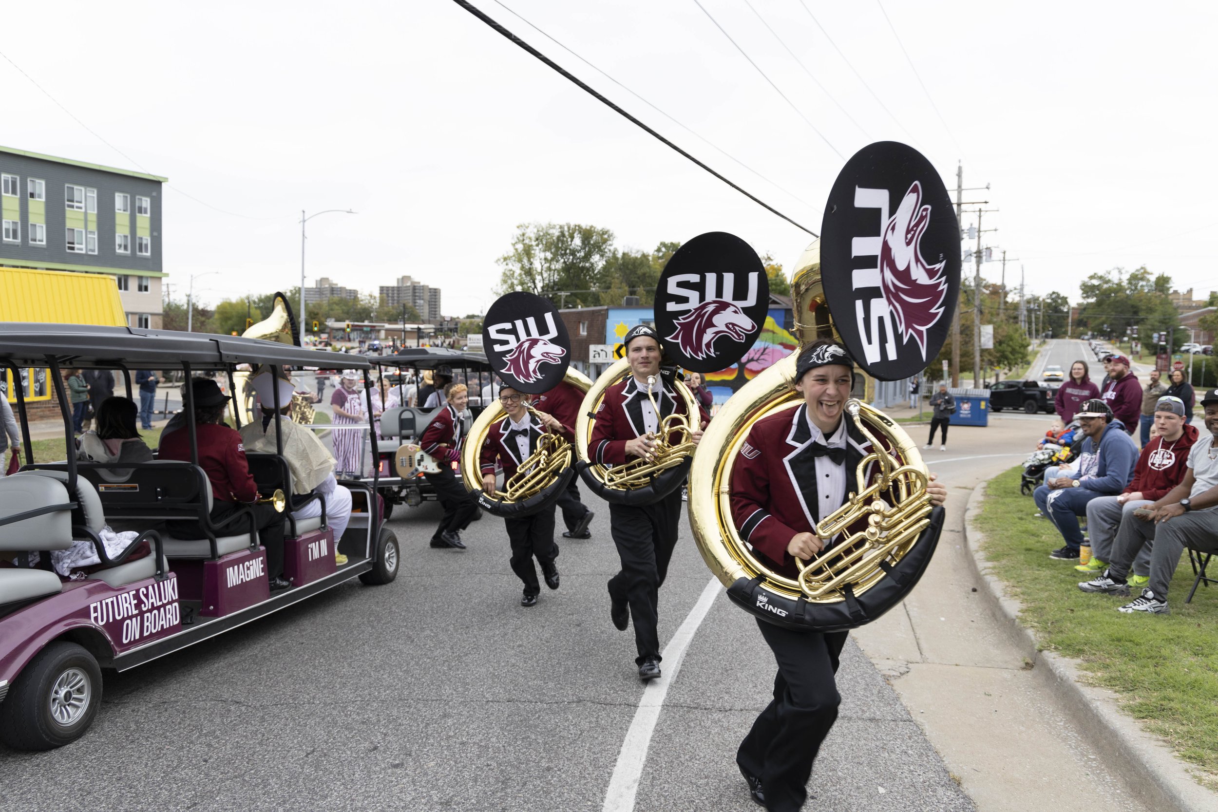 Marching Saluki Sousaphone players run in front of the golf cart and back in the Homecoming Parade Oct. 25, 2025 in Carbondale, Illinois.